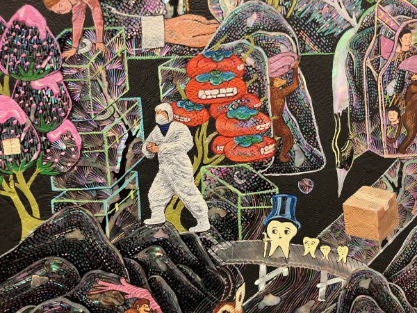 I almost walked right past Kim’s work distracted by the too-muchness of it. But fortunately I hesitated and was treated to a captivating artwork about everything. I was reminded of Hieronymus Bosch and the horrors of his Dante-inspired hellscapes with all manner of demons feasting on and torturing human souls amidst the backdrop of eternal fire. Or the dense cells of Chris Ware’s graphic novels. But we encounter an updated tableau of horrors and vignettes featuring vaguely familiar authorities like a group of figures in hazmat suits with laser guns trying to subdue a mythical dragon. Or a female figure doing something furtive while an oozing upside-down ice cream cone encroaches upon her.