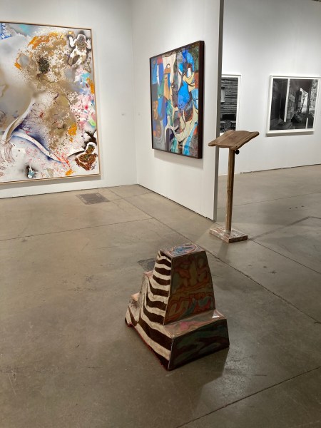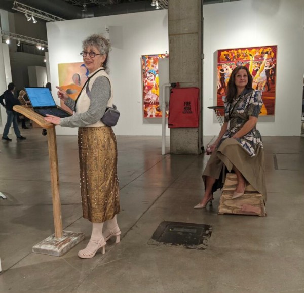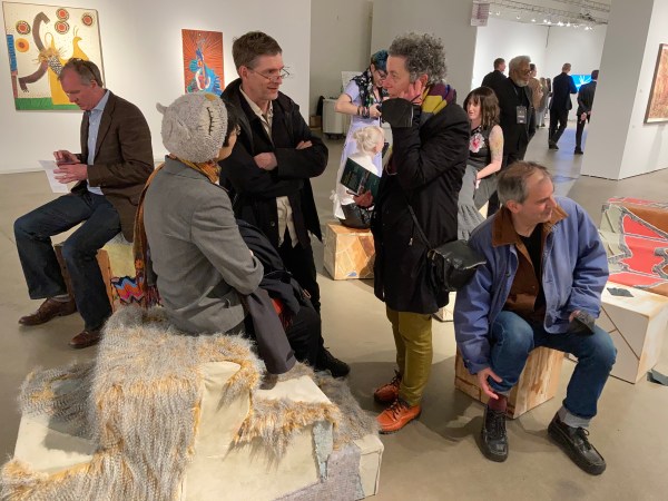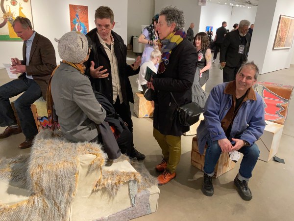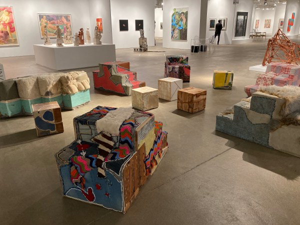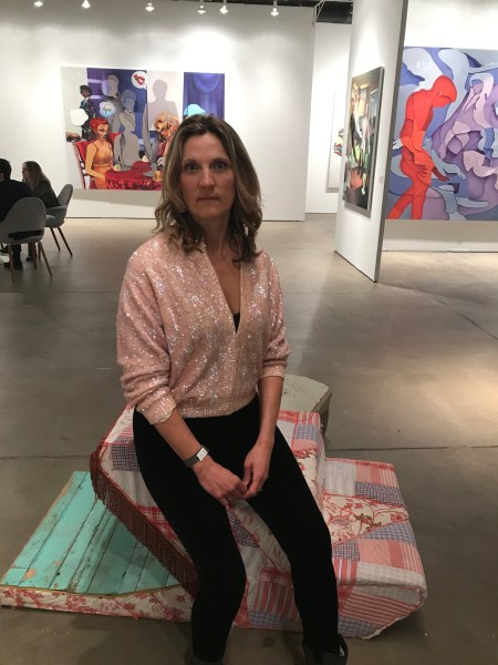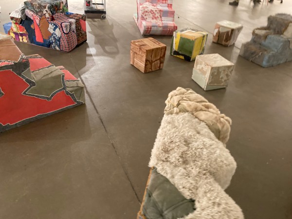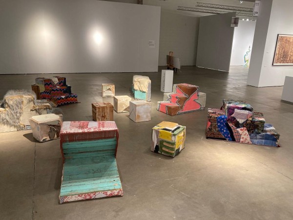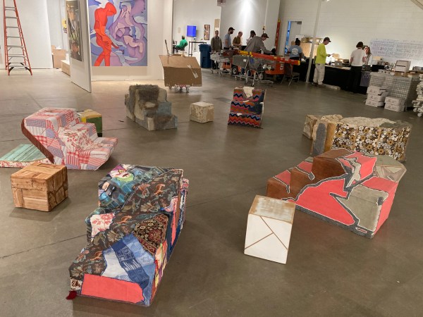 Stoop Culture. Found textiles and wood materials, zebra skin, furniture from closed Chicago public schools, plastic, wood, mixed media.