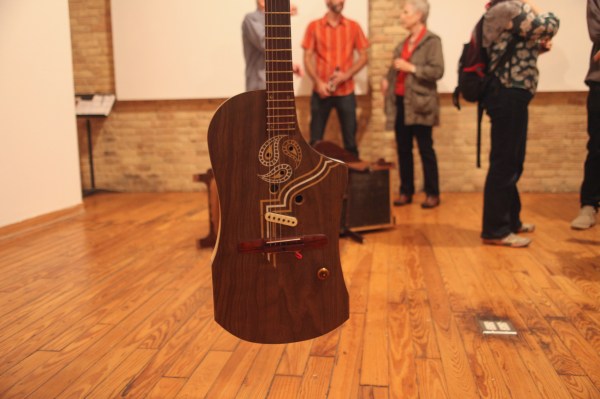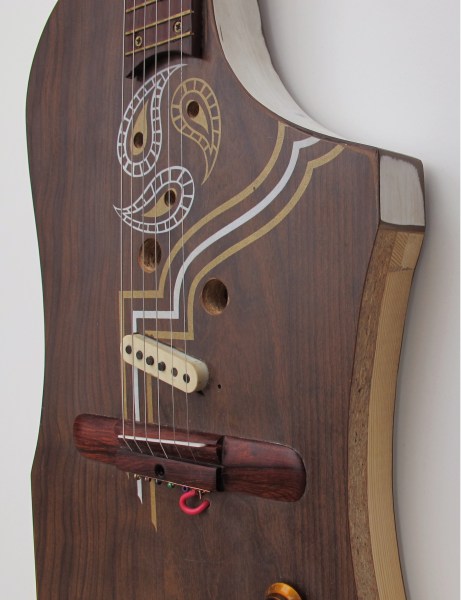 At times, Preus foregrounds the beauty marks and scars of his material— a found, hand-painted design becomes the focal point of a guitar, imbuing it with a certain narrative quality. Other times, his material serves as a sort of visual pun— you’ve heard of making bedposts metaphorically sing? Well, Preus does so literally, turning one quarter of an old four-poster bed into an upright bass. By combining a fondness for his material’s embedded histories, with a craft person’s skill at building, and an artist’s eye for shine, his pieces celebrate their past proudly, reveling in their physical- ity. Oftentimes, this infuses them with a certain anthropomorphism. And yet, they are incomplete without us— who will play them? Who will listen to them played? The wistful air of the stray and the mutt also cloaks them, a perfect tragic foil to the aforementioned comedy.
