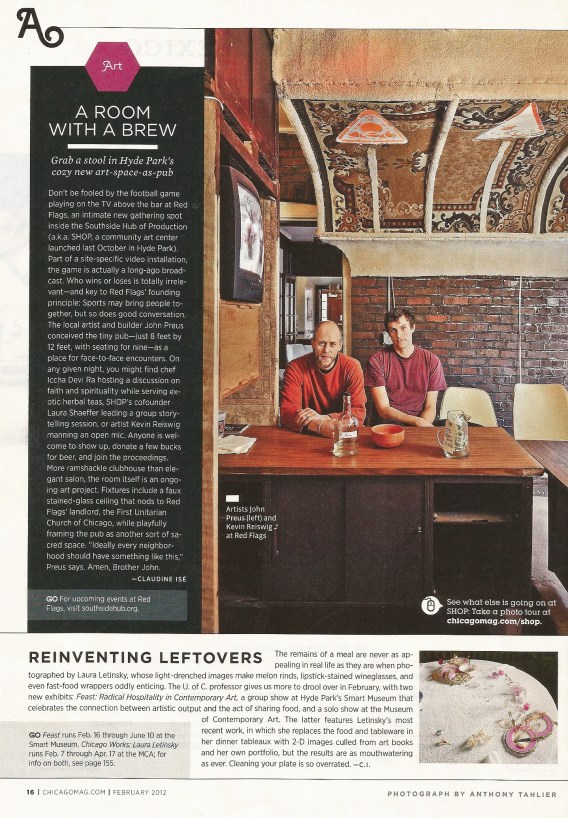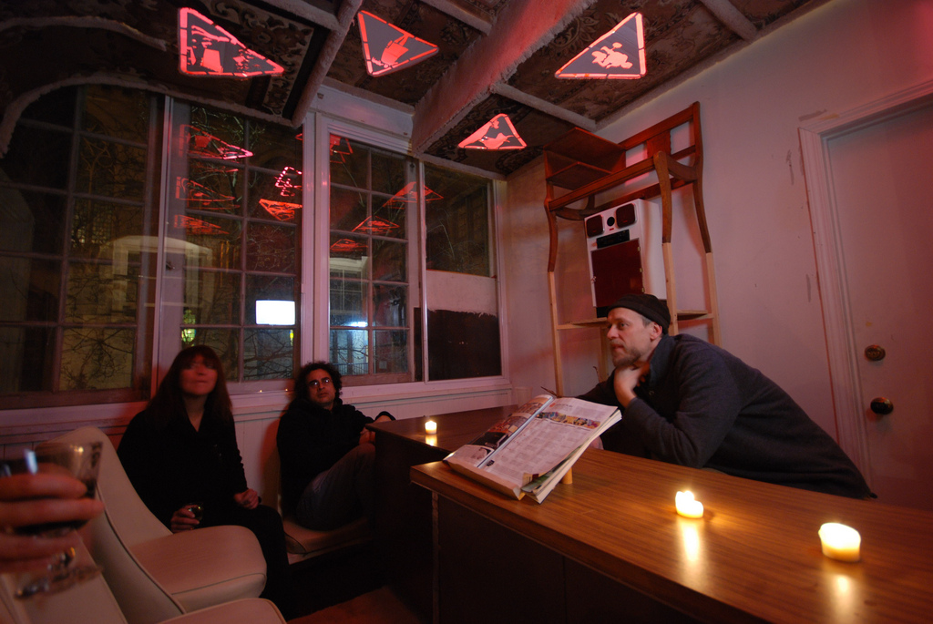 Red Flags is a small pub-like environment inside of SHOP, which is inside of Fenn House, a mansion in Hyde Park, owned by First Unitarian Church, who in their generosity and grace of spirit, have allowed for all manner of experimental pairings to take place under their roof. Red Flags came into being as a response to certain zoning criteria governing that certain social and productive activities do not belong in proximity to each other. While zoning law is a complex cocktail of politics, economics, public safety and subjective judgment, in some ways it legislates against healthy communities by putting necessary elements far away from each other. Red Flags is a hybrid, part pub, part chapel, part public, part private. It serves as an intimate space for hosting conversations among small groups, and as a service area for larger events in the house.