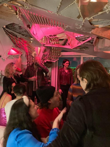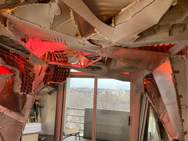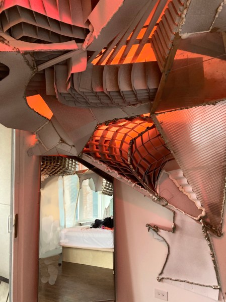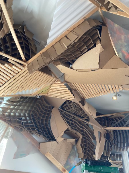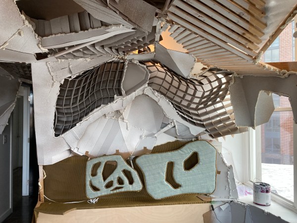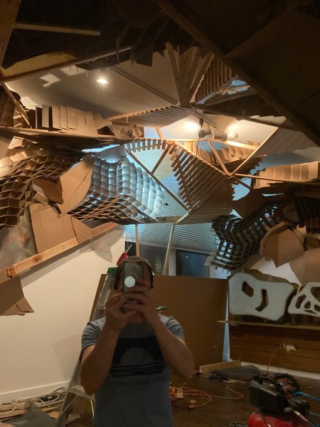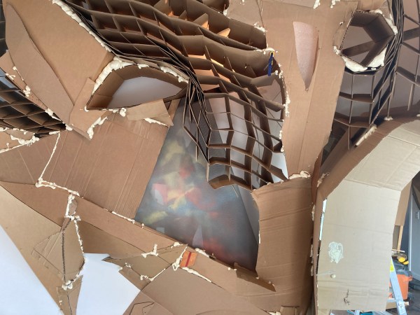 The second iteration of the installation in which cardboard, spray foam, light and paint were added. Fabrication assistance from Solveig Preus.