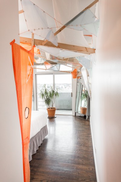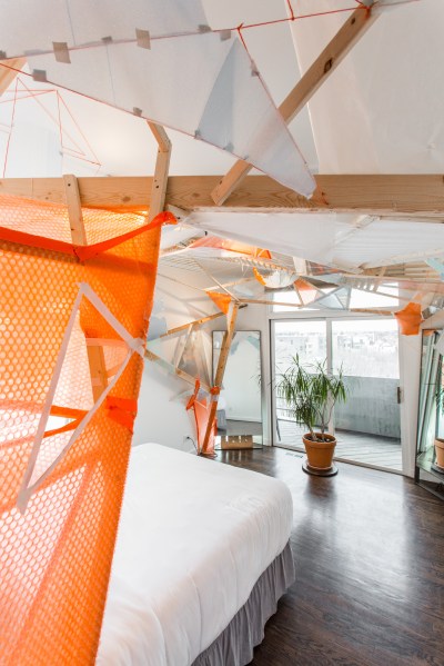An installation in two iterations produced in collaboration with Preus’s former partner, Genevieve Wolff, for Open House Contemporary, The Neutralized Third explored the externalization of an intimate relationship through material associations. Made for a bedroom with salvaged wood, packing materials, string, yarn, plastic, fabric, and paint.