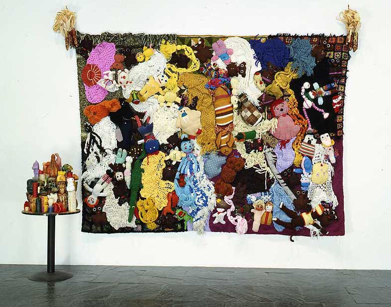 Mike Kelley”More Love Hours Than Can Ever Be Repaaid and The Wages of Sin,” 1987Stuffed fabric toys and afghans on canvas with dried corn; wax candles on wood and metal base90 X 119 1/4 x 5 inches (228.6 X 302.9 X 12.7 CM)Condles: 25 X 23 3/4 X 23 3/4 inches (63.5 X 60.3 X 60 CM)Base: 27 X 18 1/8 X 18 18 inches (68.6 X 46 X 46 CM)Purchase, with funds from the Painting and Sculpture CommitteeAccession Number: 89.13a-ePhoto: Sandak/Macmillan Publishing CompanyPhotograph Copyright (c) 1998: WHITNEY MUSEUM OF AMERICAN ART, NEW YORK